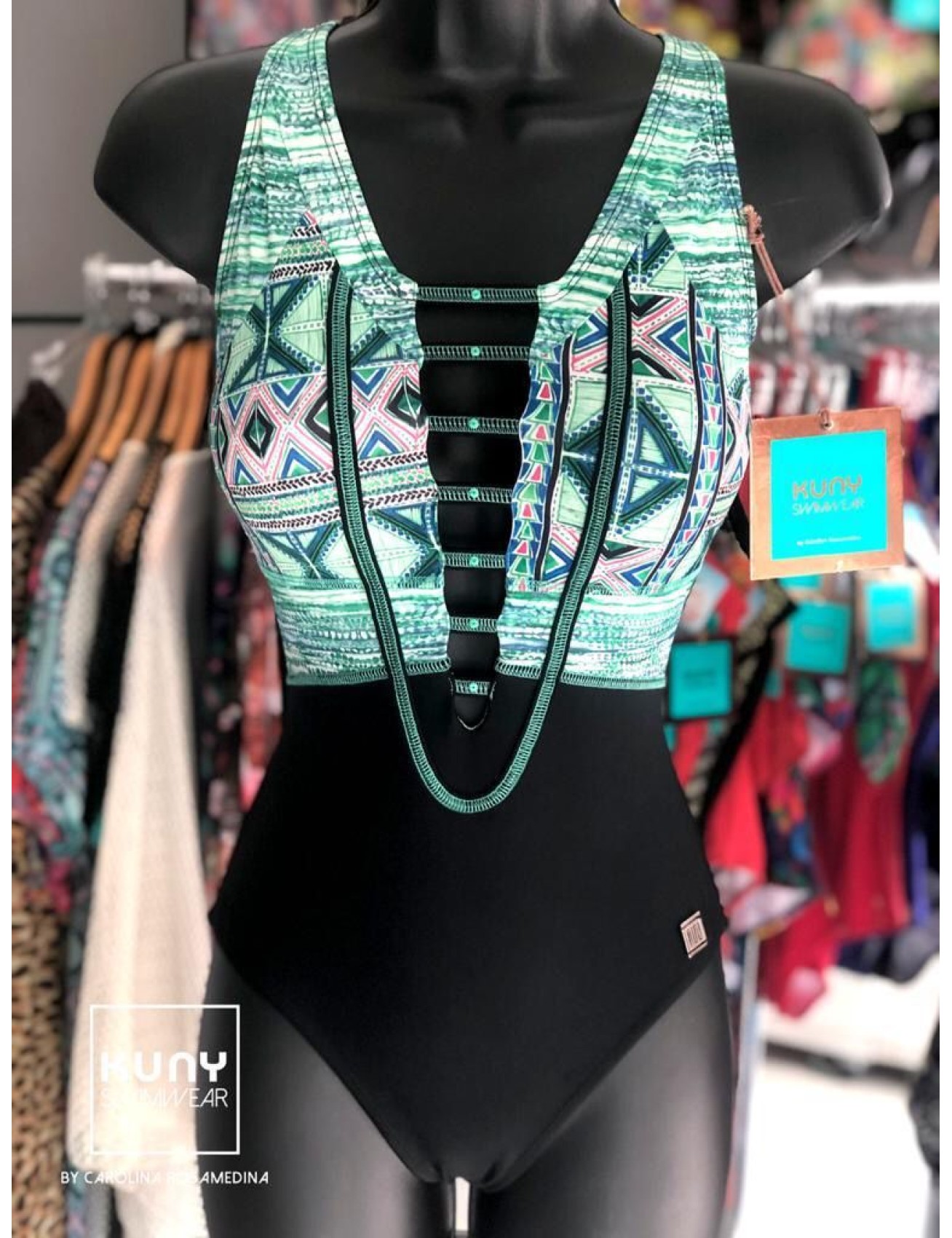 Traje de baño entero con copas, con corte bajo el busto, con espalda cruzada regulable y tejido control de abdomen.