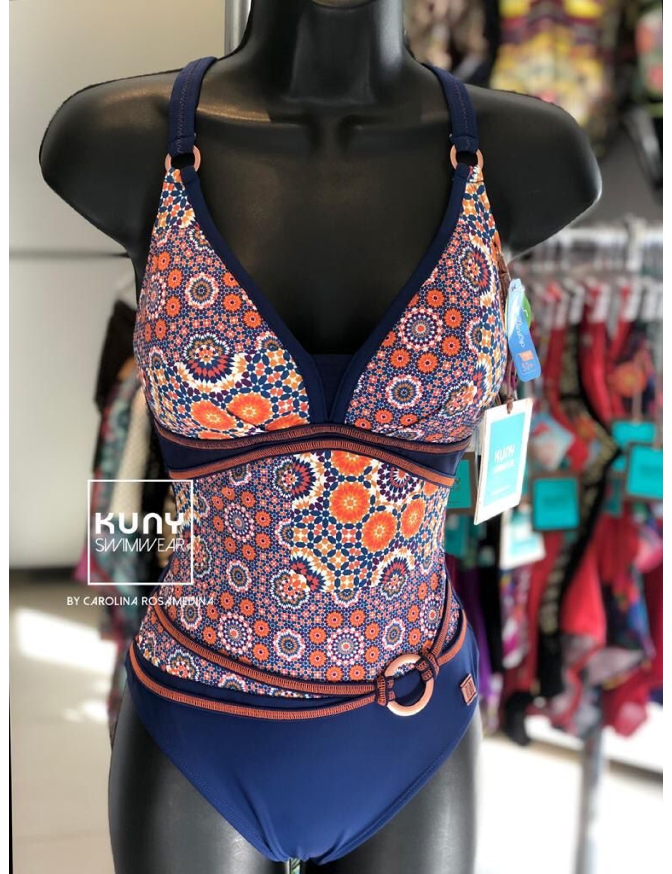 Traje de baño entero con copas removibles , con cortes, espalda cruzada y tejido control de abdomen.
