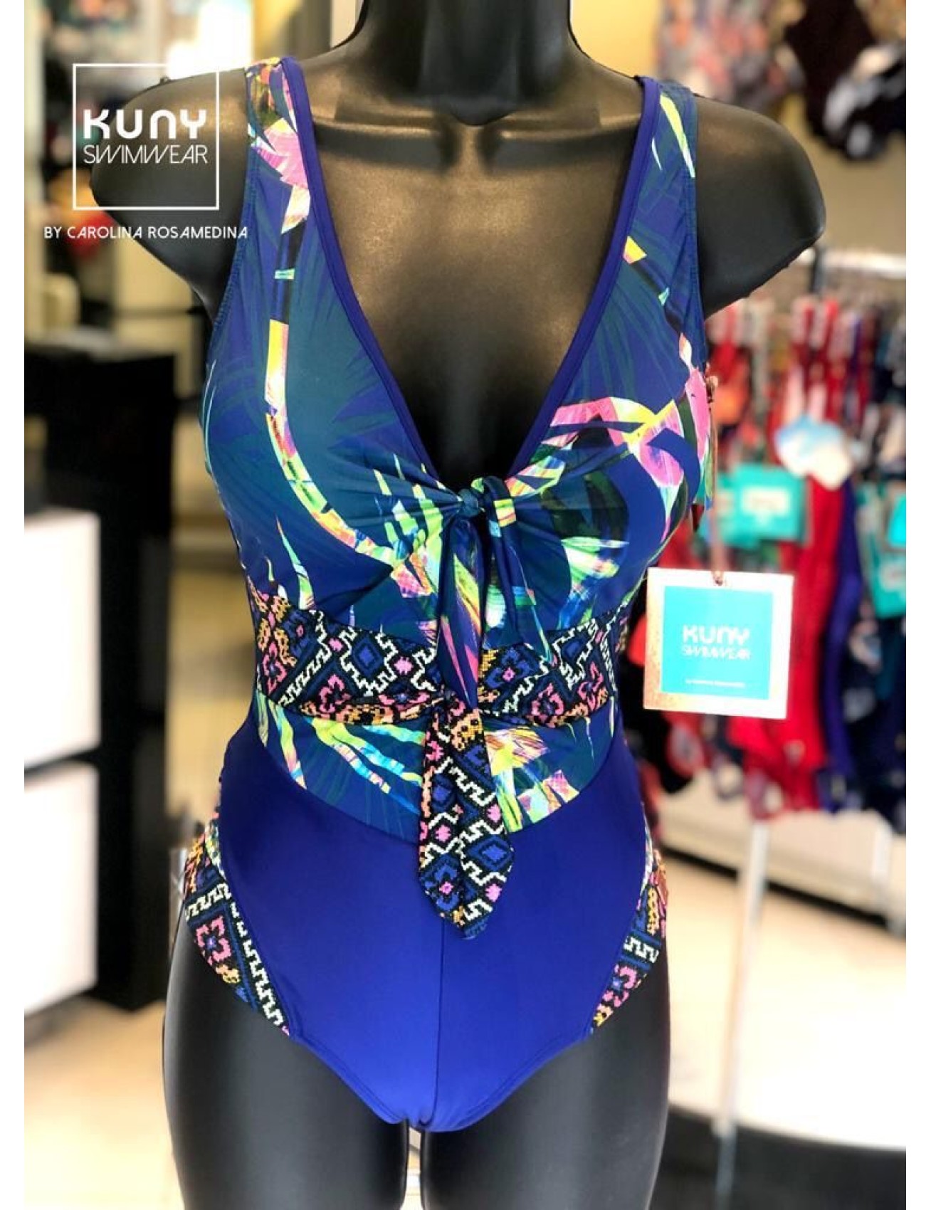 Traje de baño entero con copas, cortes y lazos en la parte delantera con espalda regulable y tejido control de abdomen.